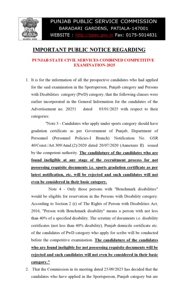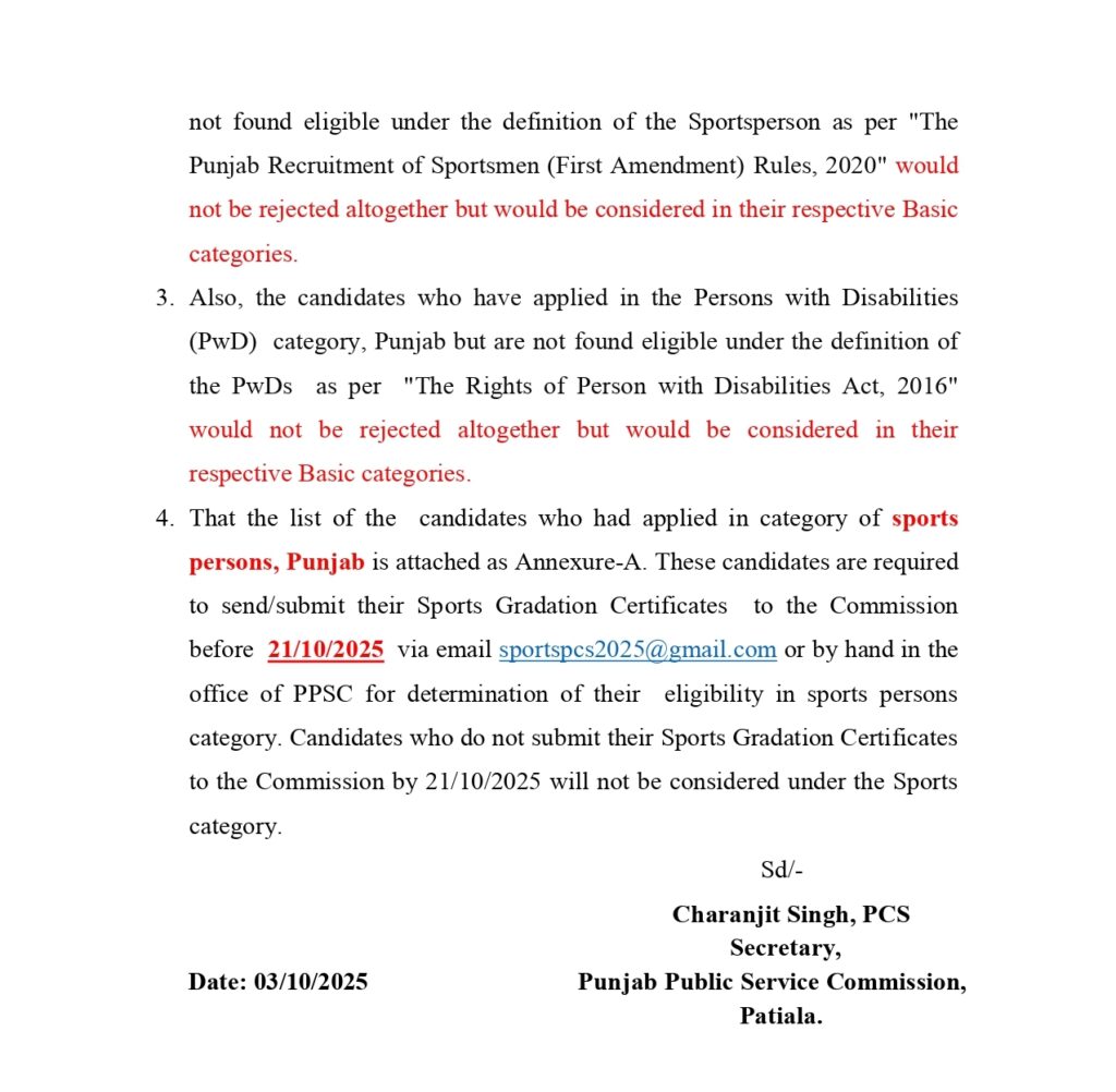 PCS 2025 – Public Notice [03 Oct 2025] – Sports Person Candidates